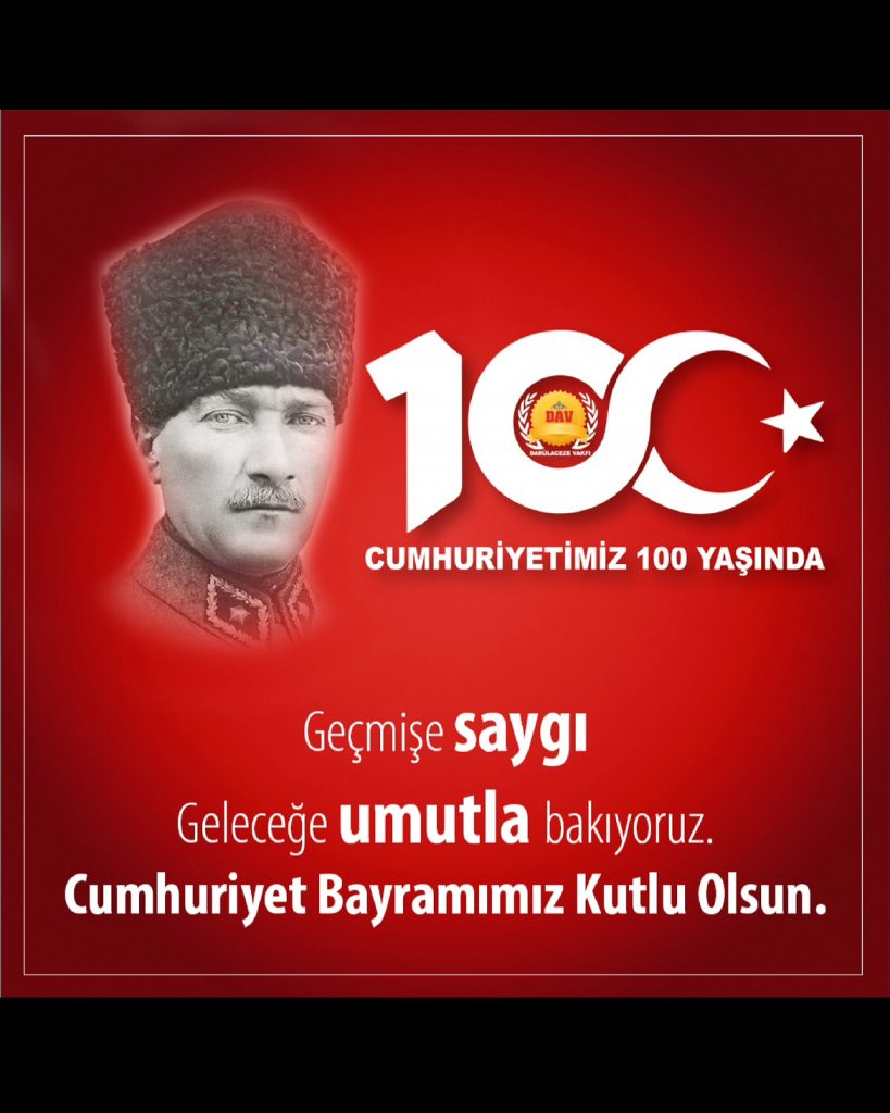 Cumhuriyet, varolma sebebimizdir. İkinci Yüz Yılımıza girerken ilk günkü heyecan, coşku ve umut bizimle olsun. Türkiye Cumhuriyet’ imizin kurucusu Ulu Önder Gazi Mustafa Kemal Atatürk, silah arkadaşları, aziz şehitlerimizi ve kahraman gazilerimizi rahmet minnet ve şükranla anar, Cumhuriyet’ imizin 100.yılını kutlarım.